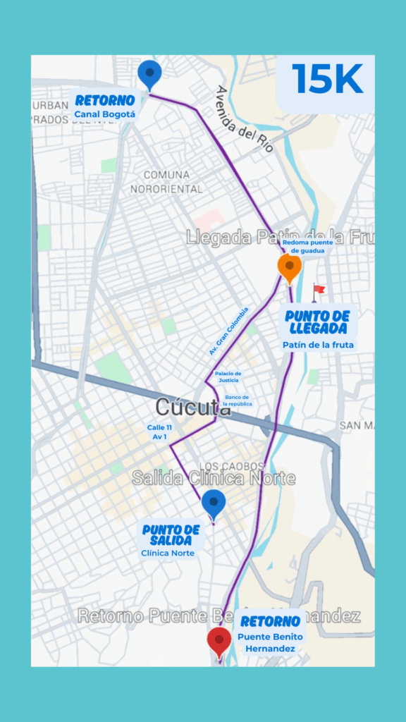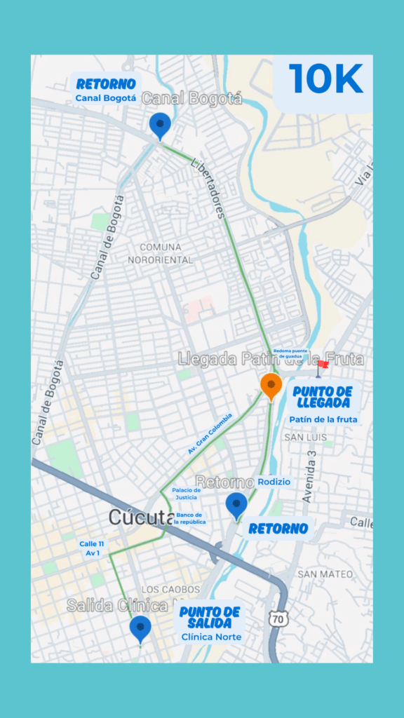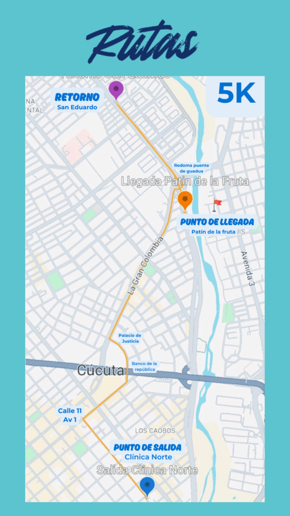 Tendremos 3 recorridos 5K, 10K y 15 K, todas las rutas inician en la Clínica Norte y terminan en el patín de la fruta